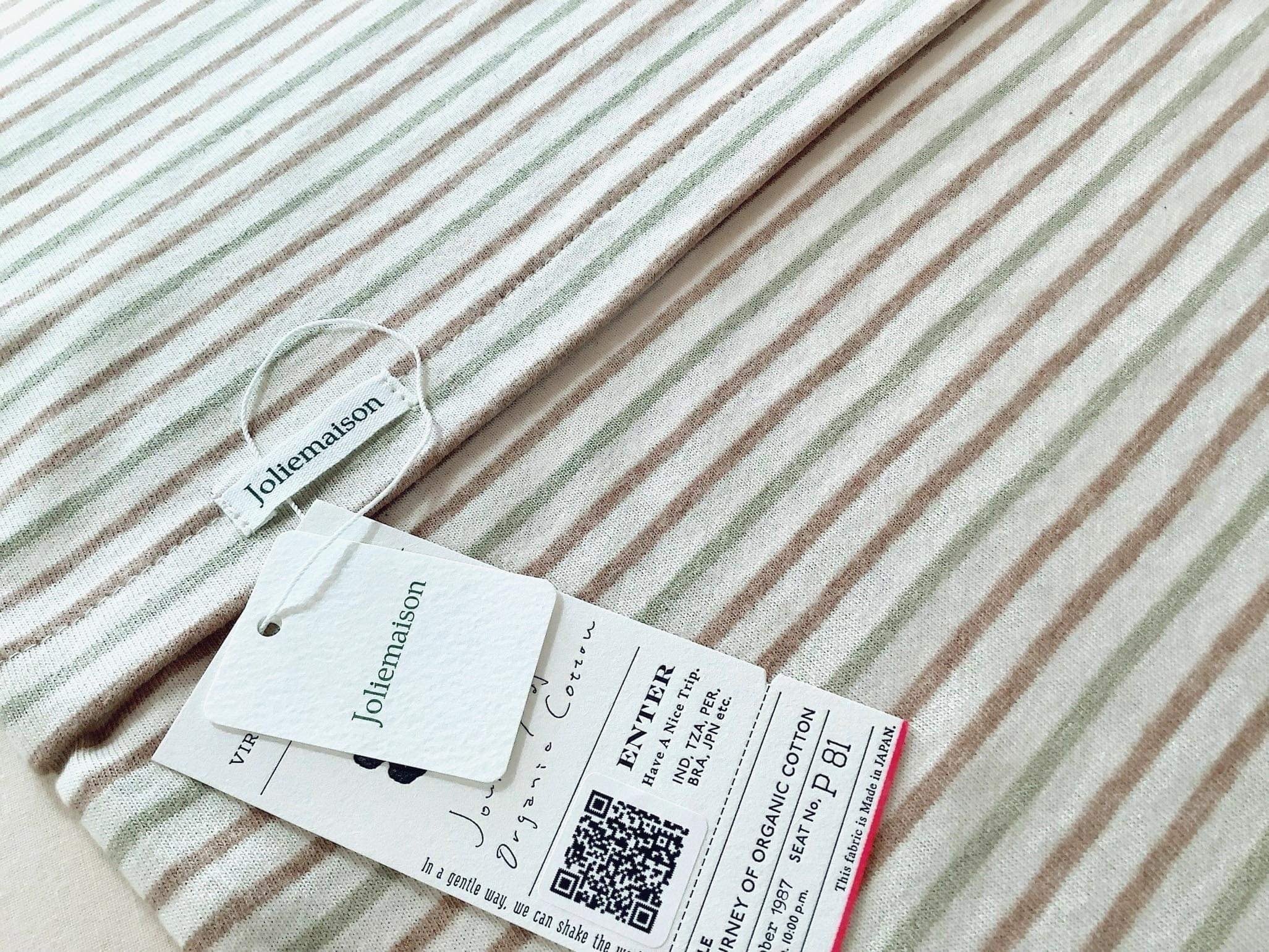 オーガニックコットン100%の20/1天竺です。0番の太めの糸でしっかり編まれた程よい厚みで伸縮性があり、赤ちゃんの繊細な肌に、柔らかく優しい肌触りの素材です。キナリ、ブラウン、グリーンのシンプルなボーダーは太すぎず細すぎず、落ち着きのある印象です。