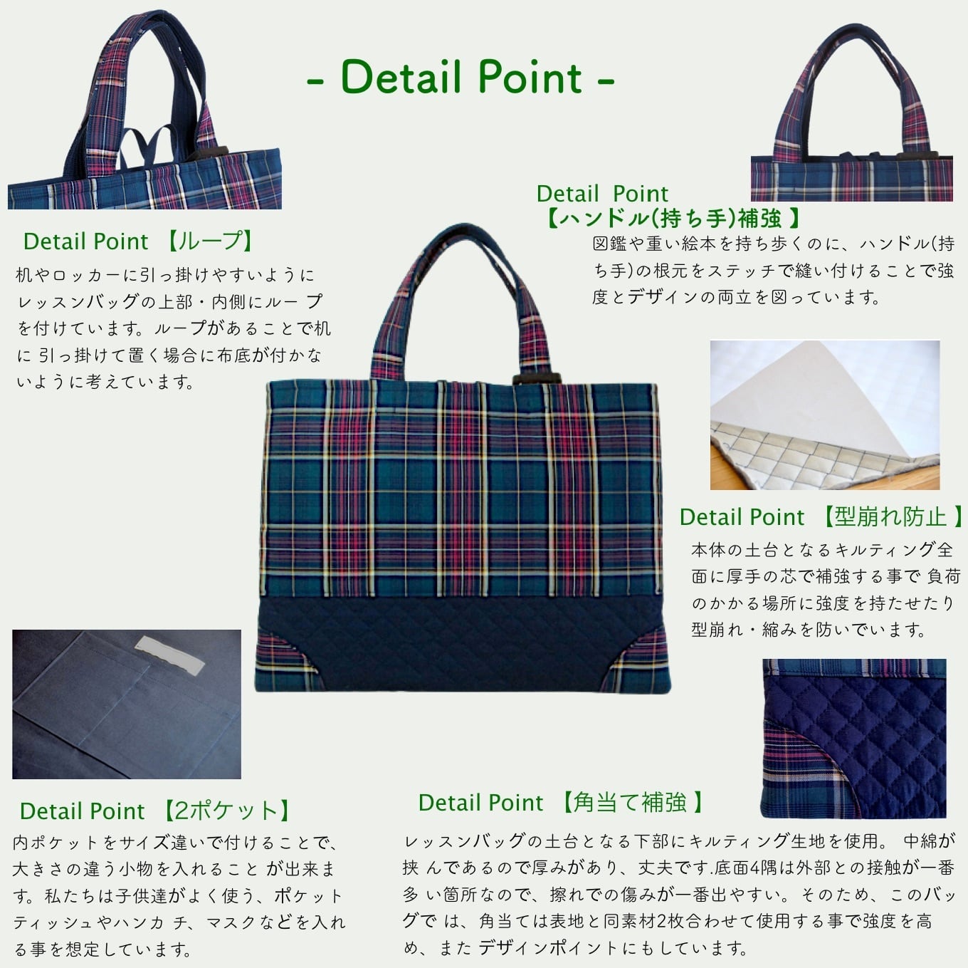 【ブラックフライデーSALE】クチュリエチームが贈る最高峰のファブリックバッグ 、ジョリーメゾンのレッスンバッグ(緑チェック) | キッズかばん 幼稚園 保育園 通園バッグ 絵本袋 通学 おけいこ ピアノ ショルダー肩掛